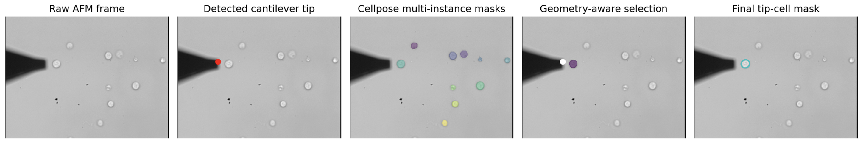 5-panel strip showing each stage: raw AFM frame → detected cantilever tip → Cellpose multi-instance masks → geometry-aware selection → final tip-cell mask