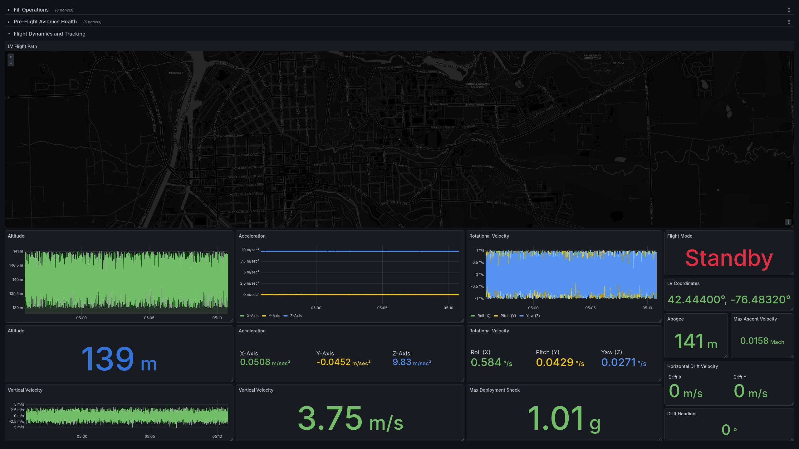 Engineered real-time digital signal processing queries and comprehensive mission control Grafana dashboards for live flight monitoring.